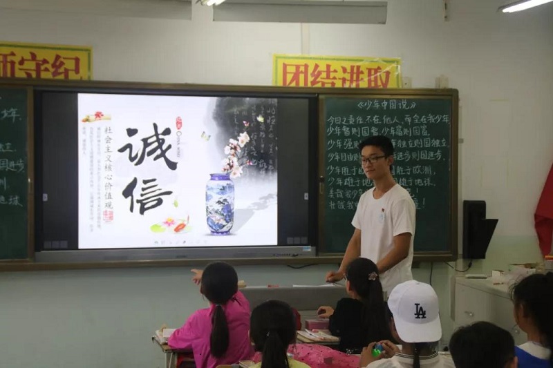 志愿者小老师动情的授课让孩子们理解“诚信”、“敬业”和“爱国”,通过孩子们分享小故事以及生活中简单事例,深入分析,逐渐让孩子们从心里感悟。还通过简单却富有哲理的箴言使小学生内化于心、外化于行。少年强则国强,少年独立则国独立,今天做祖国的好儿童,明天做祖国的建设者,美好的生活属于少年,美丽的中国梦属于少年。