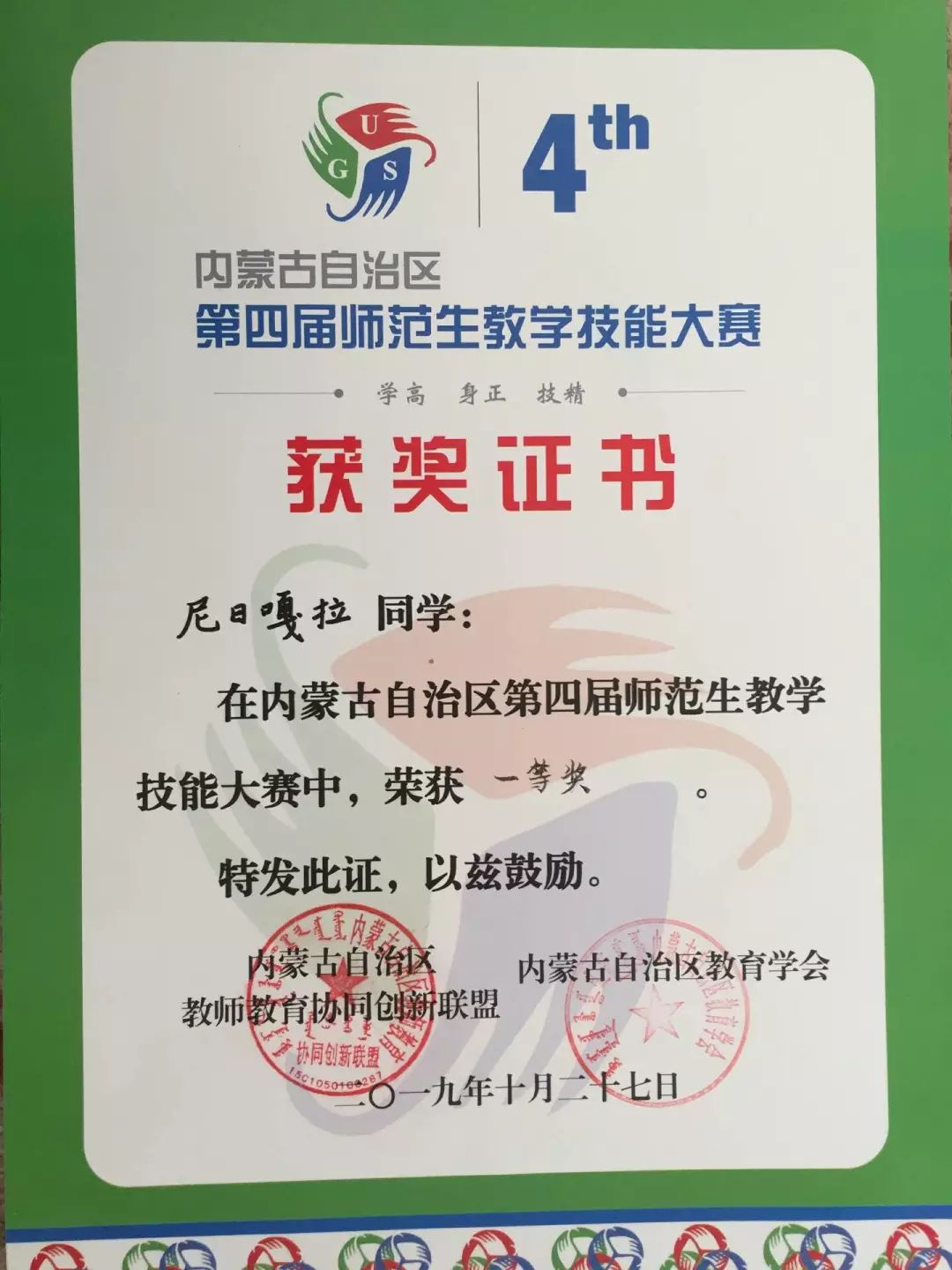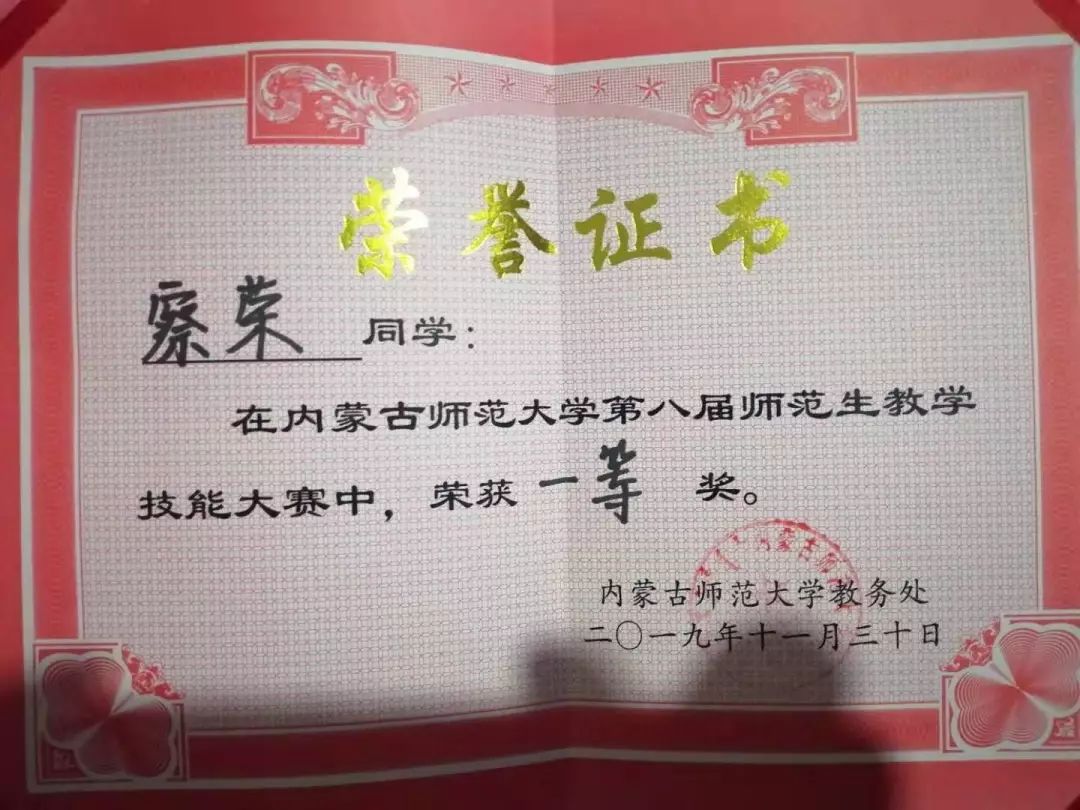 16级数学应用数学蒙班学生,2019年荣获内蒙古自治区第四届师范生教学技能大赛数学与应用数学(蒙古语)组一等奖。