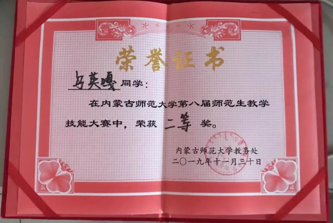 16级数学应用数学蒙班学生,2019年荣获内蒙古自治区第四届师范生教学技能大赛数学与应用数学(蒙古语)组二等奖。