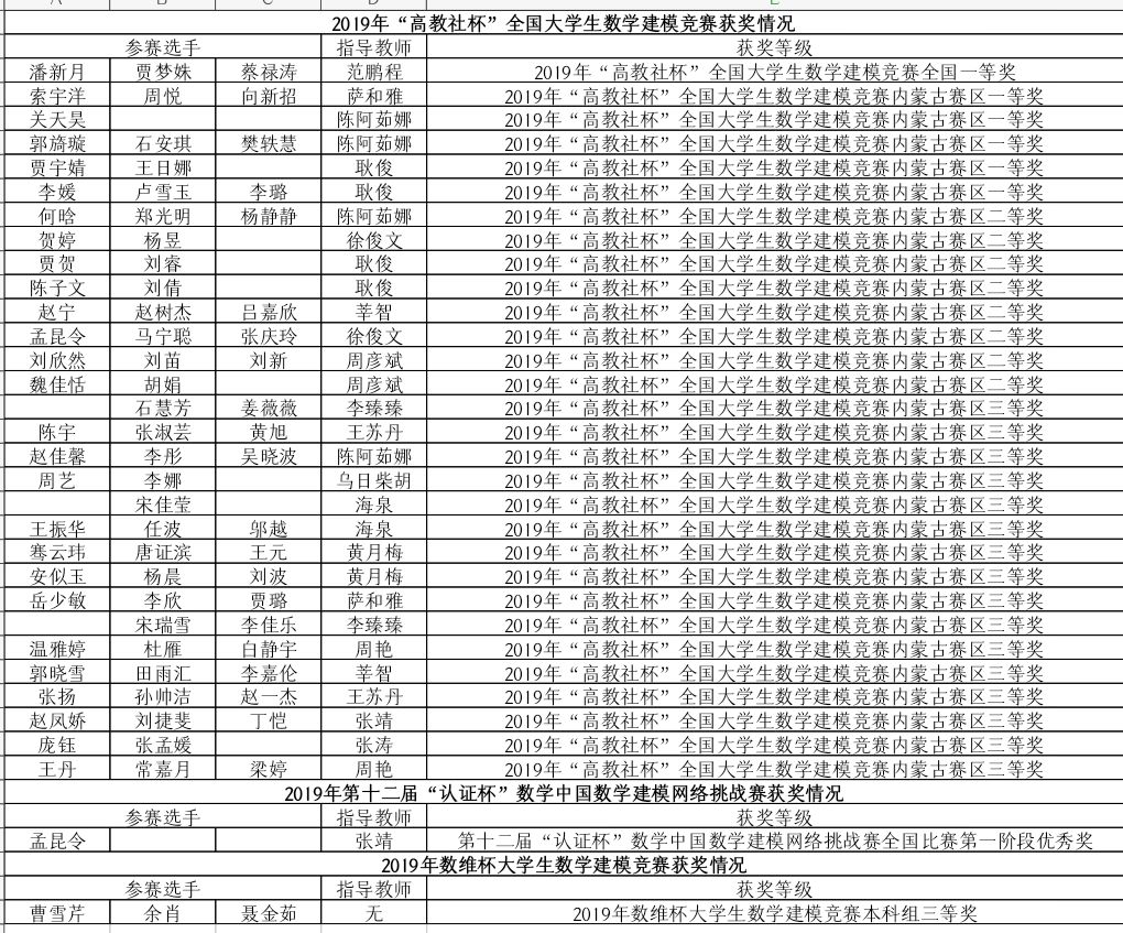 2019年开元官网学生积极参与各类数学建模竞赛,并屡获佳绩,其中在2019“高教社杯”全国大学生数学建模竞赛中,由开元官网2017级潘新月、贾梦姝、蔡禄涛三位同学组成,范鹏程老师指导的队获得2019年全国大学生数学建模竞赛全国一等奖。这是我校首次获得该项比赛全国一等奖,也是全区高校在本次比赛中获得的唯一一等奖,另有5个队获得内蒙古自治区赛区一等奖,8个队获得赛区二等奖,16个队获得赛区三等奖;在2019第十二届“认证杯”数学中国数学建模网络挑战赛中1队获得全国比赛第一阶段优秀奖;在2019数维杯大学生数学建模竞赛中1队获得本科组三等奖。