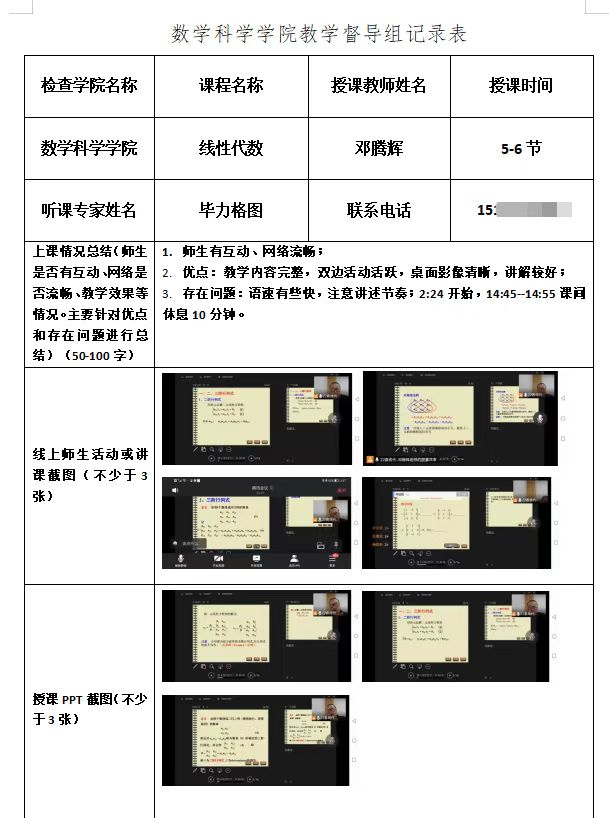 学院领导班子、教学委员会、督导组通过随机进入线上课程观看教师在线授课实况、查阅在线教学资源、了解学生在线学习互动等方式开展教学督导检查,并填写教学督导记录表,及时反馈督导检查情况。