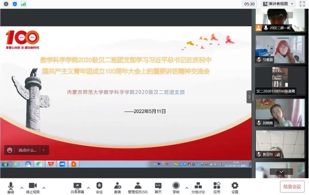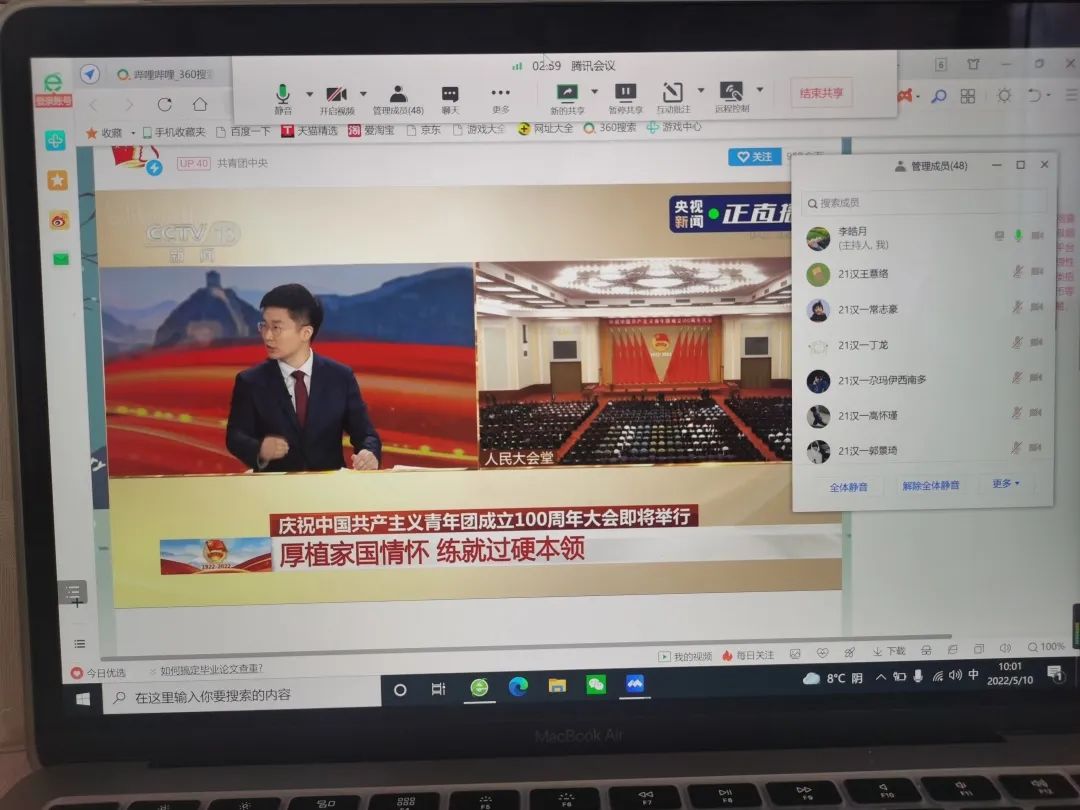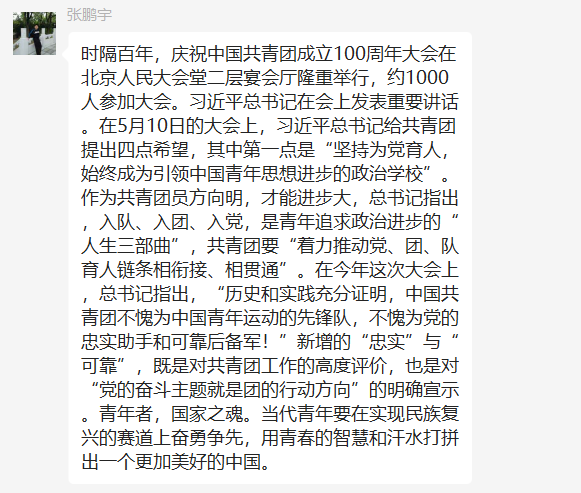 5月10日,庆祝中国共产主义青年团成立 100 周年大会在京隆重举行,习近平总书记发表重要讲话。ky开元集团全体团员青年收看了大会盛况,聆听了总书记的重要讲话。会后,各团支部积极行动,组织开展了学习习近平总书记在庆祝中国共产主义青年团成立100周年大会上的重要讲话精神交流会,分享学习心得,感悟党的关怀,以实际行动为团的百年华诞献礼。