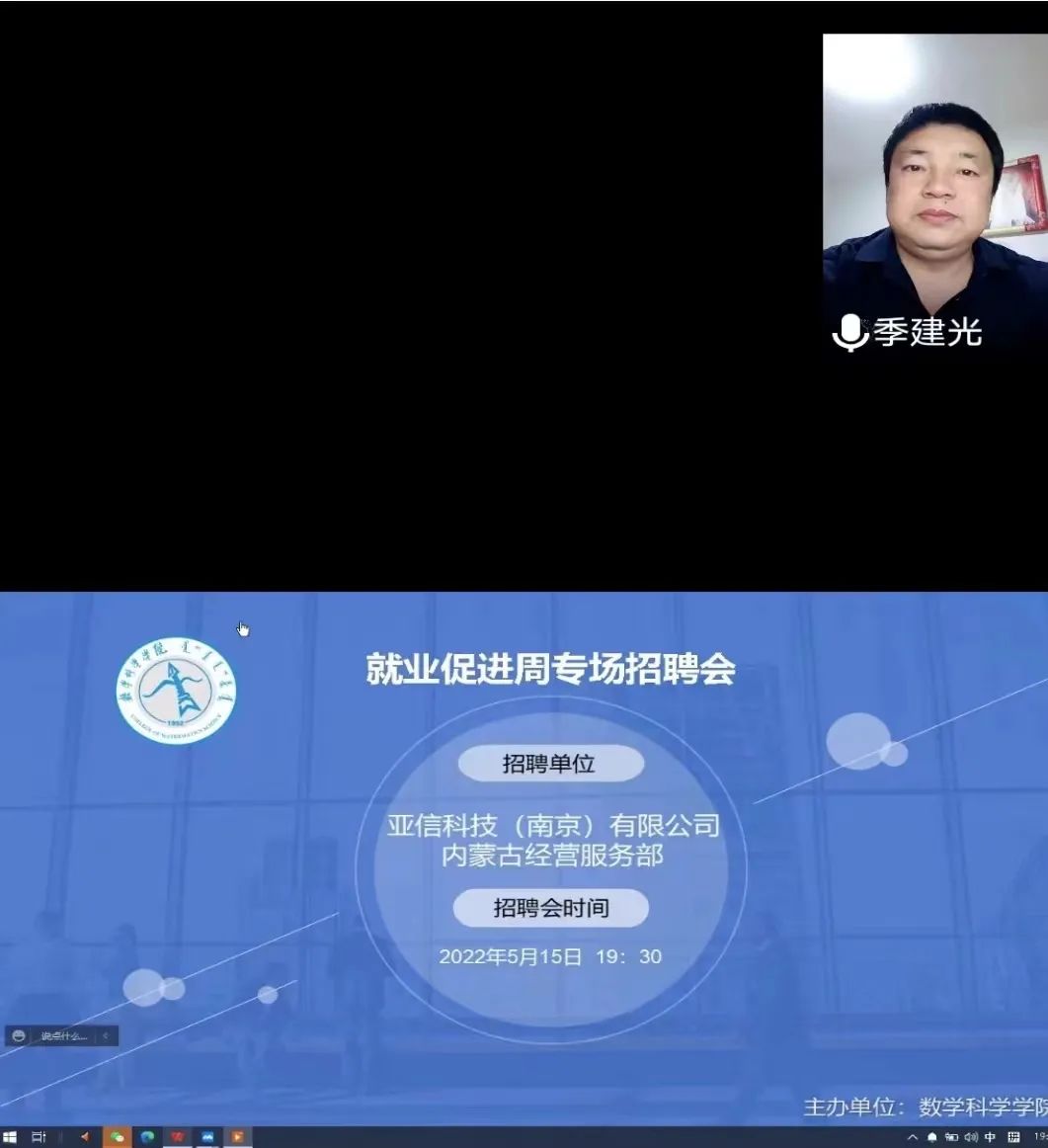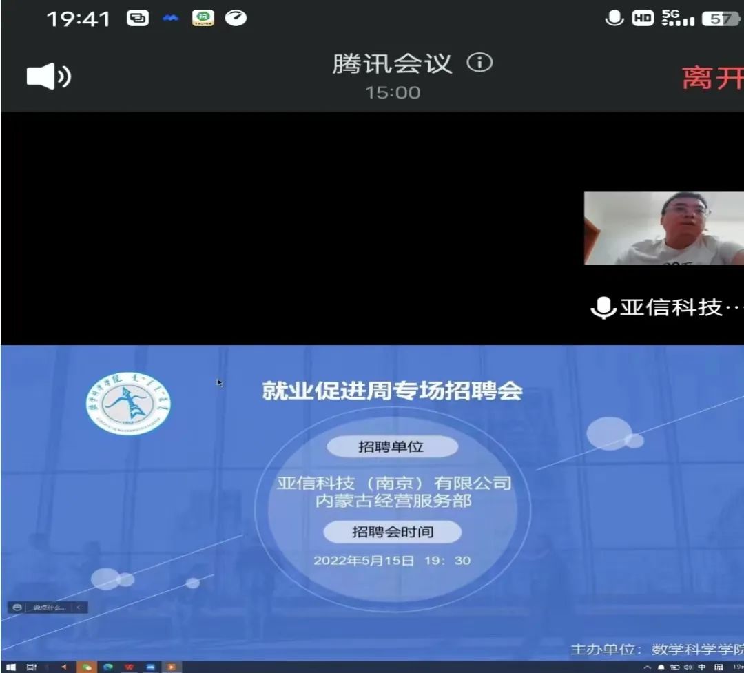 为更好的推进《ky开元集团2022届毕业生就业促进周系列活动方案》的工作要求,全力促进毕业生尽早就业、顺利择业,5月15日晚,学院针对非师范专业毕业生,邀请亚信科技(南京)有限公司内蒙古经营服务部举办了“就业促进周”网络专场招聘会,学院党委副书记季建光、学生工作与就业办公室副主任刘沙沙、辅导员萨如拉以及亚信科技(南京)有限公司内蒙古经营服务部的负责人参加招聘会议,开元官网2022届信息与计算科学和统计学专业的50多名毕业生参加本次招聘会。