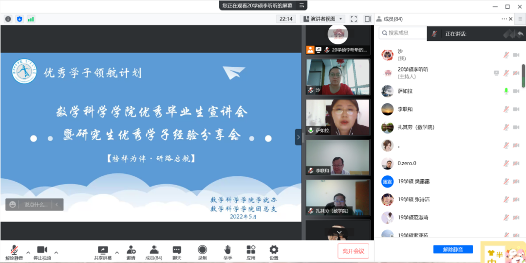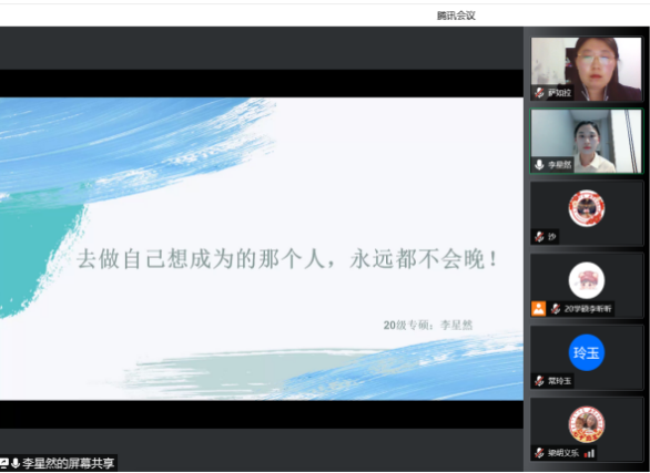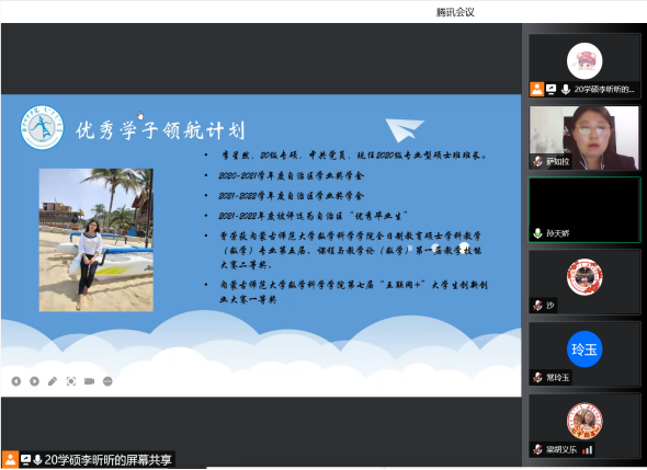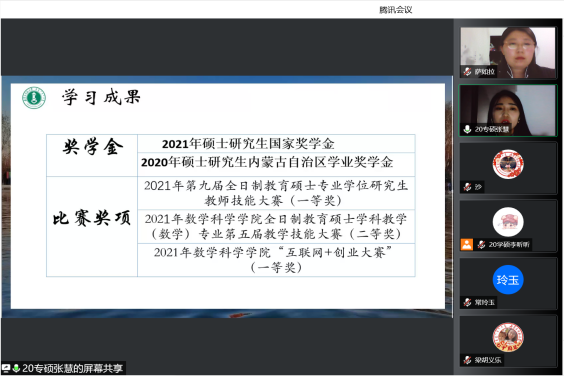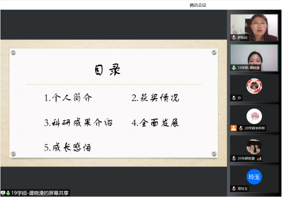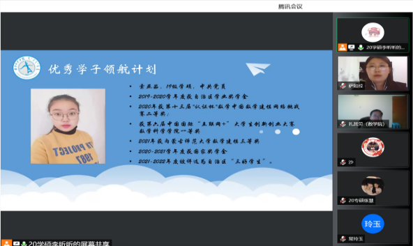 为了充分发挥研究生优秀学子的示范引领作用,更好地落实《ky开元集团关于开展“榜样为伴·研路启航”研究生国家奖学金获得者事迹宣传活动的通知》《内蒙古自治区教育厅关于报送2022年春季学期研究生教育教学典型案例的通知》《关于组织开展ky开元集团“学生劳动教育宣传月”活动的通知》等文件要求,开元官网于5月23日晚,组织全体研究生开展“ky开元集团优秀毕业生宣讲会暨研究生优秀学子经验分享会”,邀请开元官网2021年度国家奖学金获得者索亚茹、张慧,2021年度自治区奖学金获得者孙天娇、谭晓漫,2021-2022年度自治区“优秀毕业生”李星然、“三好学生”索亚茹,共5名优秀学子为大家分享自己学习生涯中的经验和感悟。