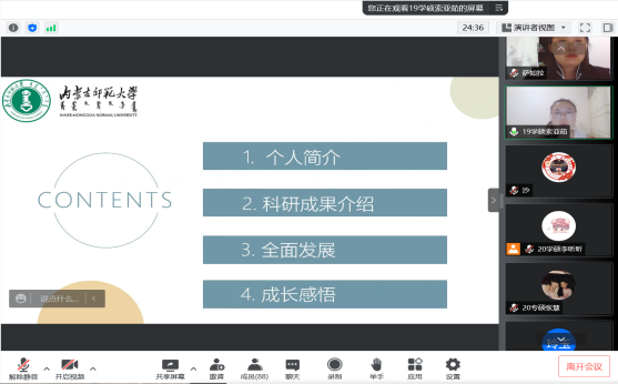 5位优秀学子分别分享了学习、科研、就业、心态、生活、任职等方面的经验与成长感悟,并寄语师弟师妹们在科研过程中不仅要明确目标,掌握专业知识,更要有一个好心态,缓解压力,劳逸结合,享受平凡中的不平凡。