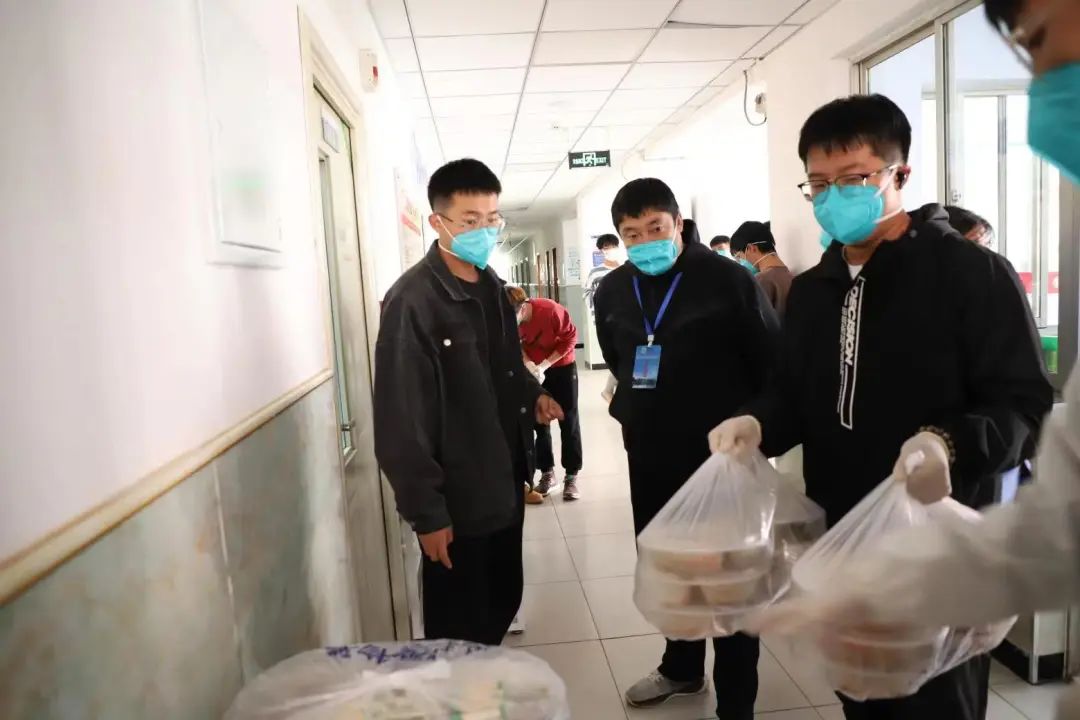 扎其劳院长和志愿者们共同负责将学生的一日三餐送到宿舍楼,保障静默期间同学们能够及时吃到热乎的饭菜。