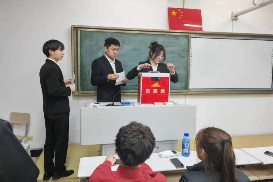 选举大会上,团总支副书记阿茹罕老师宣读《ky开元集团第三十二次学生代表大会代表选举办法》、《共青团ky开元集团第十三次代表大会代表选举法》、监票人建议名单和计票人建议名单,经过举手表决,全体通过。经过监票人检查票箱正常并加封后,由计票人领取并向各代表分发选票。各代表填写选票,监票人、计票人投票,并引导其他代表投票。投票完毕后开箱清点选票。