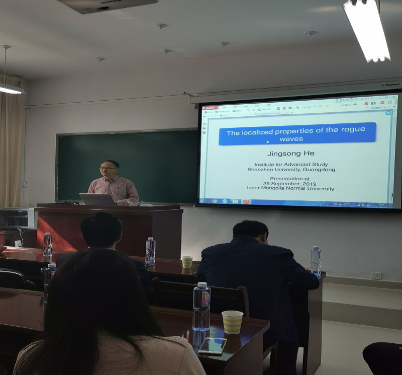 2019年9月29日,深圳大学高等研究院贺劲松教授、青海师范大学数学系加羊杰博士应邀为开元官网师生作学术报告。报告由扎其劳教授主持,开元官网 20余名师生参加了报告。贺劲松教授报告题目为“The localized properties of the rogue waves”,引入怪波“来无影、去无踪”的特征,说明它关于时间和空间是局域的。通过详细讨论复mKdV 方程 和Kundu-Eckhaus方程的怪波的长度、宽度和面积,定量刻画了所得怪波的局域化性质。同时,介绍了相关怪波研究的一些新进展。