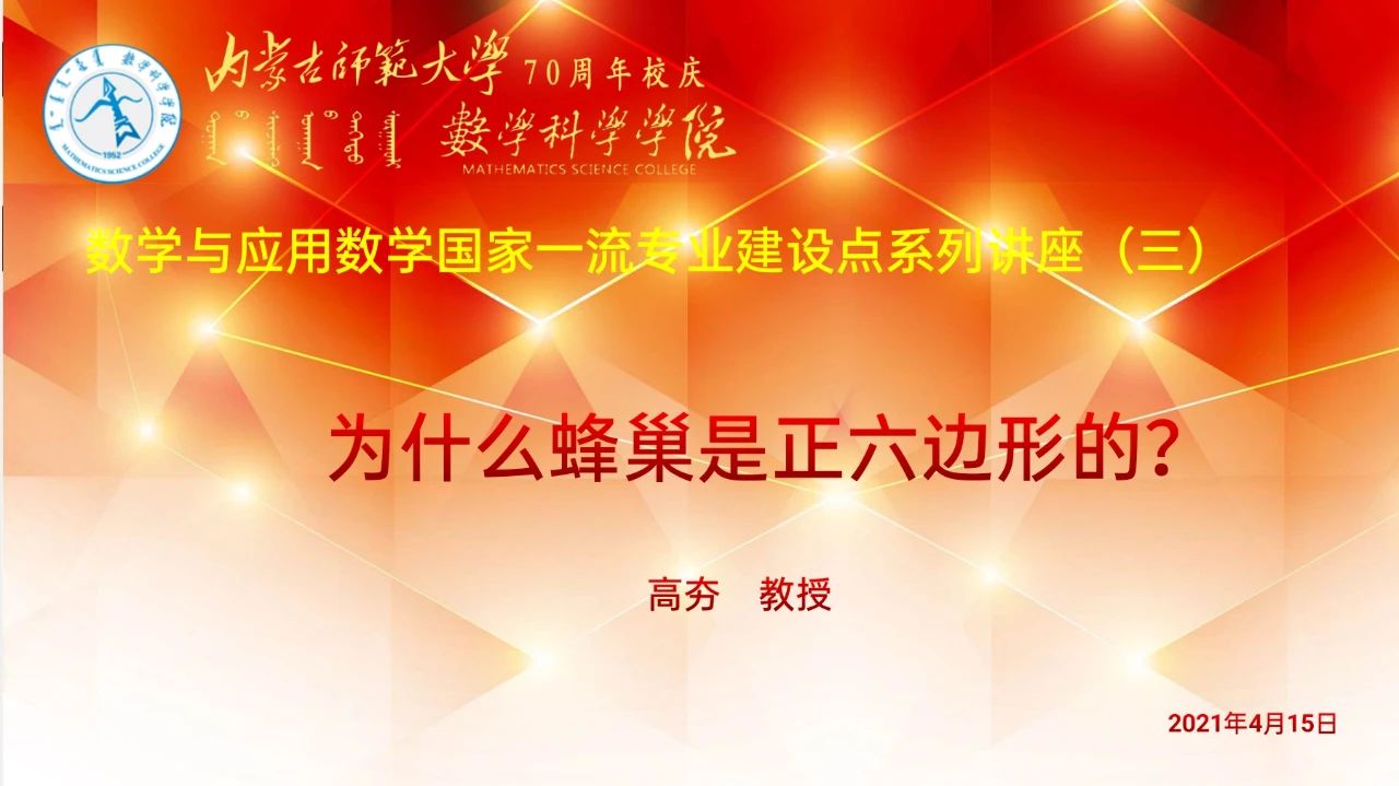 2021年4月15日,开元官网于ky开元集团盛乐校区学生事务中心学术报告厅开展了“数学与应用数学国家一流专业建设点”系列讲座第三讲。开元官网荣幸邀请到东北师范大学数学与统计学院教授、博士生导师高夯教授作为此次讲座的主讲人。参加本次讲座的老师有学院党委书记扎其劳老师,学院党委副书记、副院长季建光老师,学院副院长包霞老师,学院教授、硕士研究生导师毕力格图老师,学院教授、硕士研究生导师李春兰老师,学院团总支书记皮建东老师以及20级蒙班班主任娜仁格日乐老师。