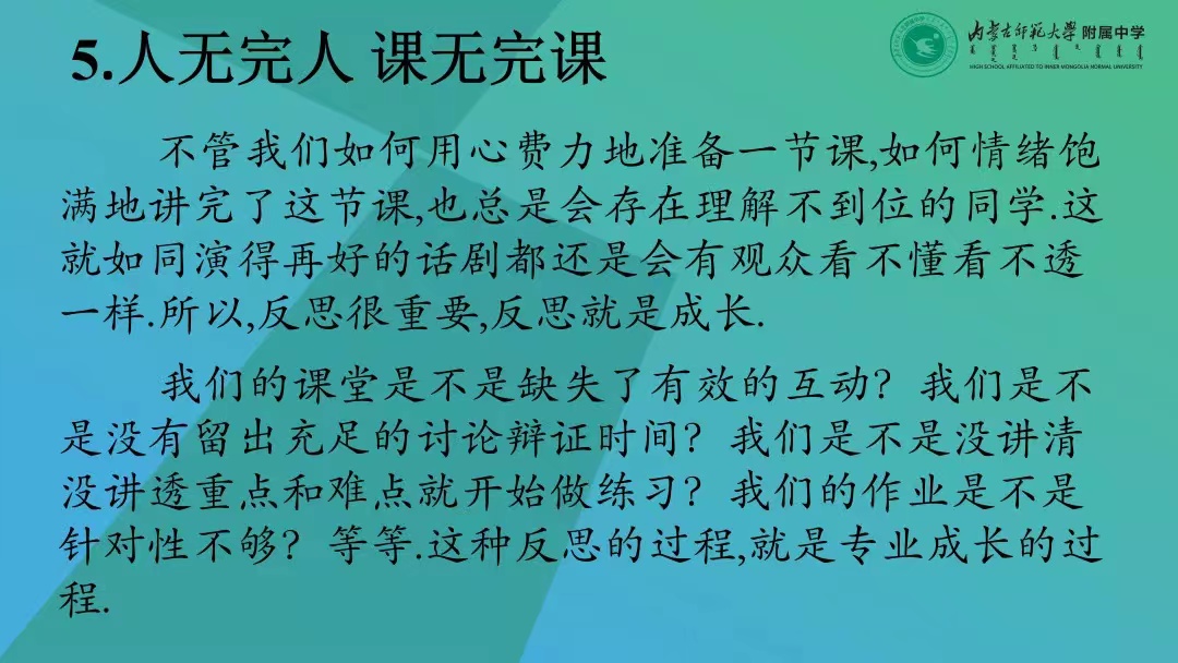 案例分析后,张生老师总结出年轻教师如何上好“一节课”所必须遵循的5条原则,人无完人,课无完课,我们应该要有用一辈子备课的精神。虽然我们青年教师尚且达不到这种境界,但是,我们应该心中有理想、有态度、有责任和追求,不断打磨自己的课堂,向着心中的“艺术品”靠近!