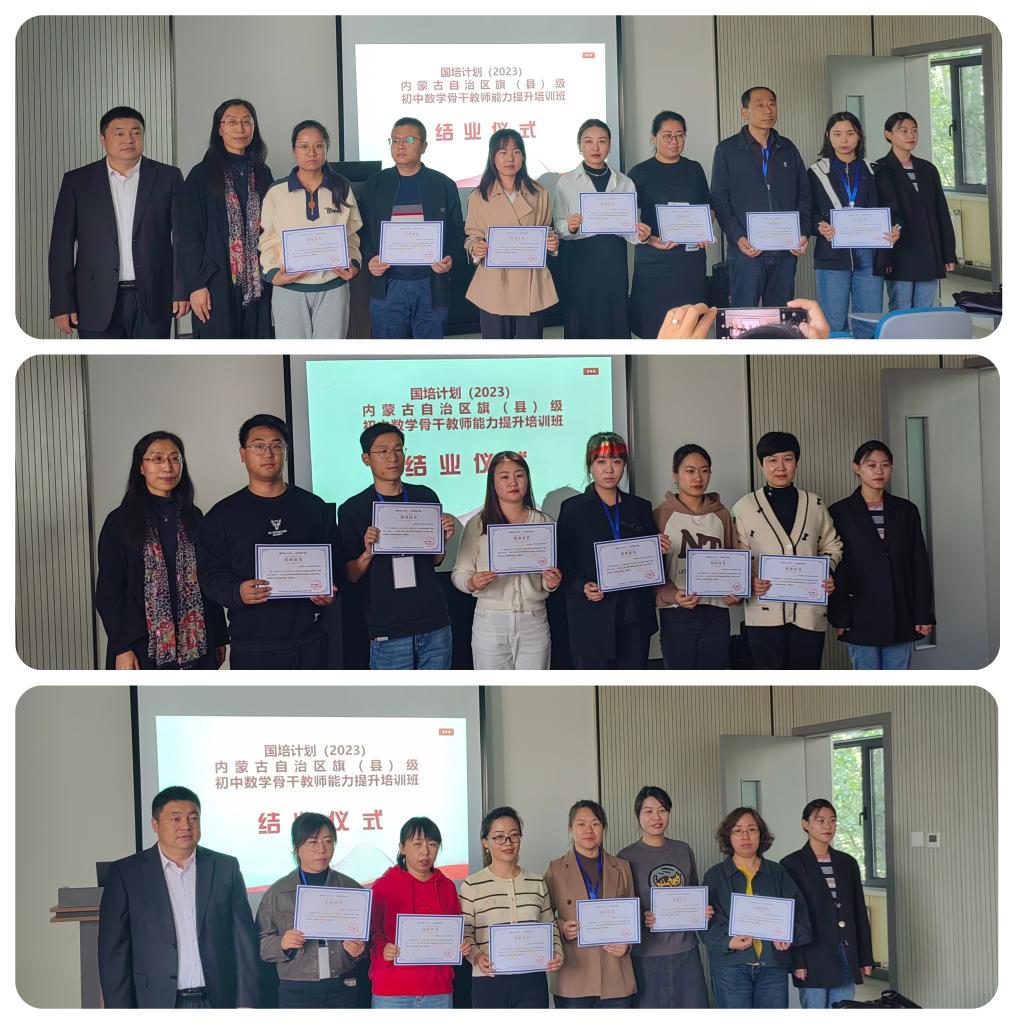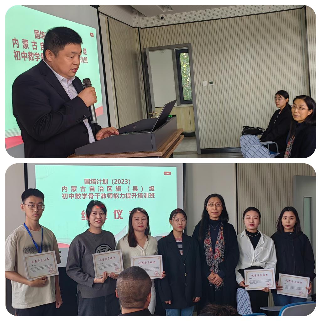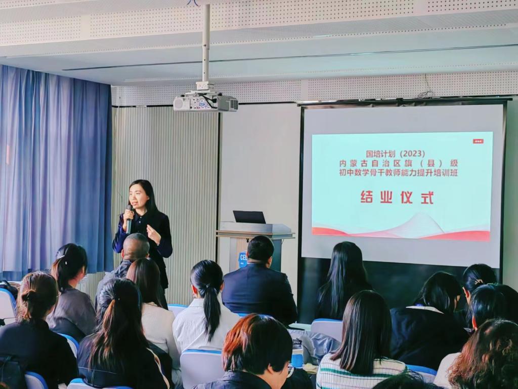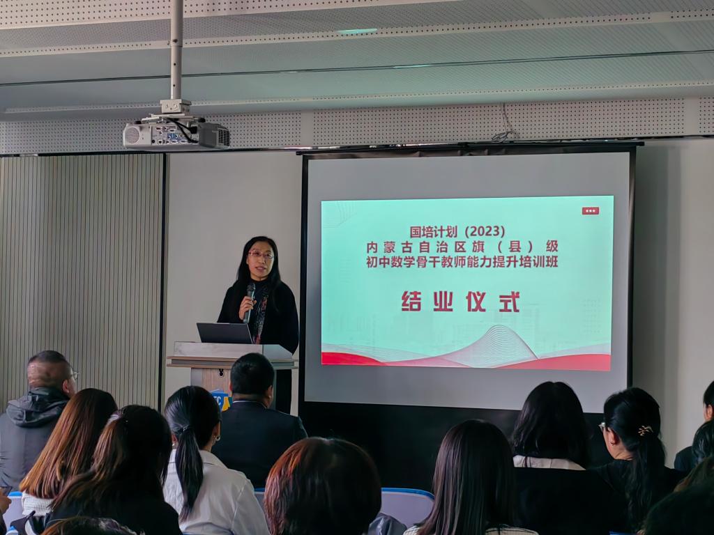 结业仪式上,培训项目对接人李春兰老师对此次培训做了系统的总结。从9月中旬学院接手这项初中数学骨干教师能力提升培训任务开始,学院领导和老师便精心安排此次培训的日程,在保障学员吃住行满意的基础上,尽力满足学员的学习要求,提升学员的教科研水平。开班以来,学员能够遵守培训的各项要求,在集中研修理论学习期间,认真聆听每一场讲座,积极与每一位培训专家互动交流,在每场讲座结束后,撰写收获、心得、建议等;在跟岗实践过程中,学院邀请呼和浩特市第三中学和呼和浩特市第四中学的内蒙古自治区数学学科带头人、数学教学技能大赛获奖者、自治区优秀班主任等19位优秀教师作为跟岗实践指导老师,在指导老师的带领下,开展课堂听课、课下研讨、集体备课、名师工作室教研活动等,每天的跟岗实践结束后学员都及时撰写实践感受。通过此次培训,学员们无论在理论知识方面,还是实践教学方面均收益颇丰。