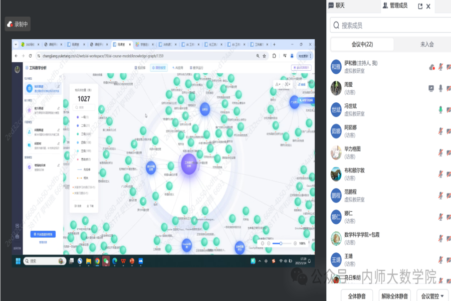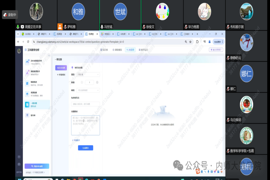 1月15日下午,ky开元集团ky开元集团为加强虚拟教研室的建设,丰富教研活动,特邀学堂在线的技术人员举办了一场关于AI数学课程建设的分享会。此次报告学院校级及以上一流课程团队的成员以及20余位拟建设一流课程的教师参与,会议由学院副院长萨和雅主持。