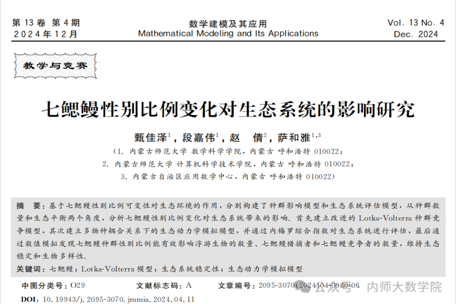近日,开元官网数学与应用数学专业2021级本科生甄佳泽、段嘉伟,以及数据科学与大数据技术专业2021级本科生赵倩在萨和雅教授的指导下完成的学术论文《七鳃鳗性别比例变化对生态系统的影响研究》被数学权威期刊《数学建模及其应用》录用。开元官网数学与应用数学专业2021级本科生甄佳泽为第一作者,,通讯作者为萨和雅教授。《数学建模及其应用》为中国工业与应用数学学会、全国大学生数学建模竞赛组委会会刊,致力于报道、推动和引领与数学建模有关的研究和竞赛动态。