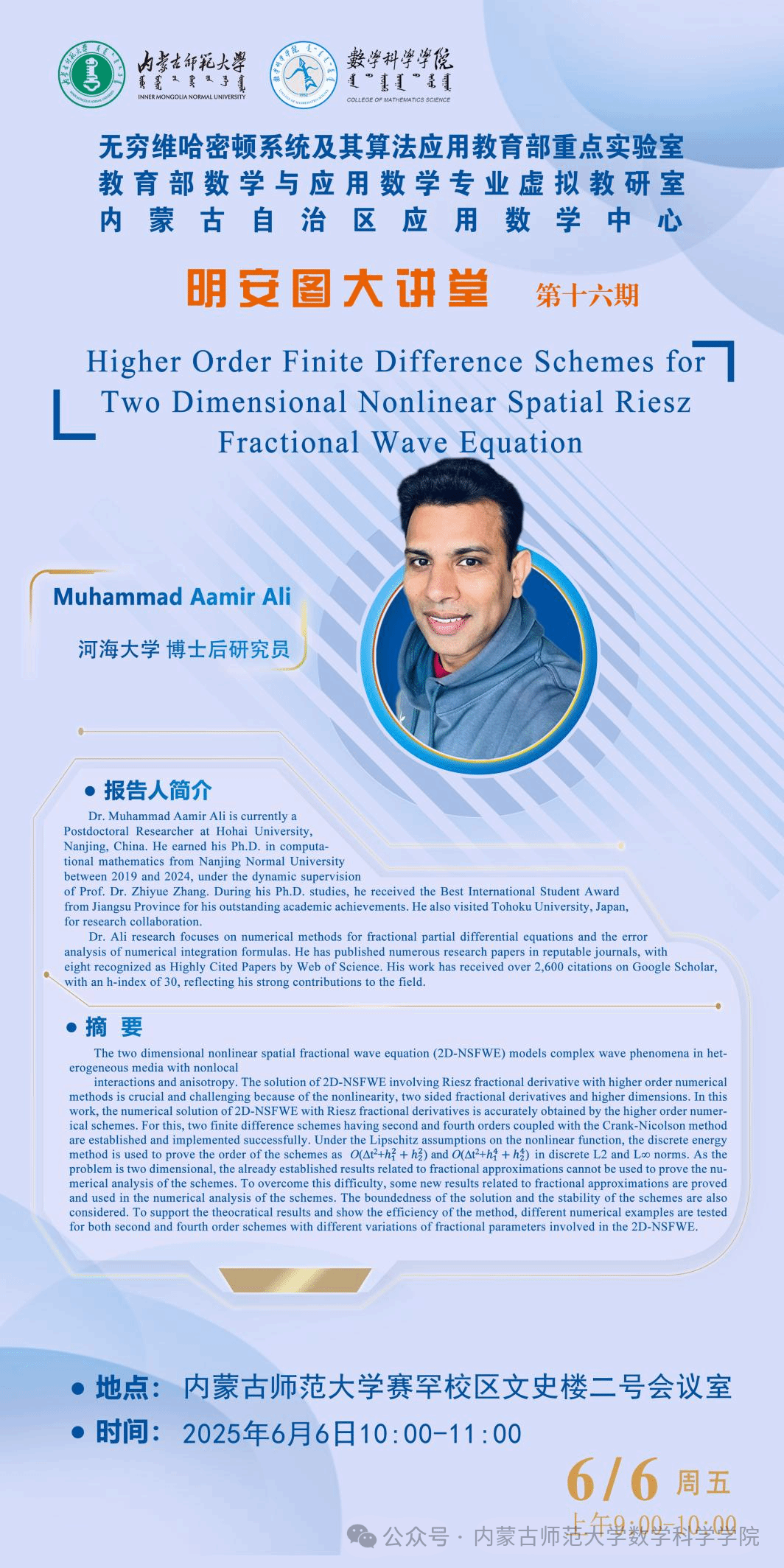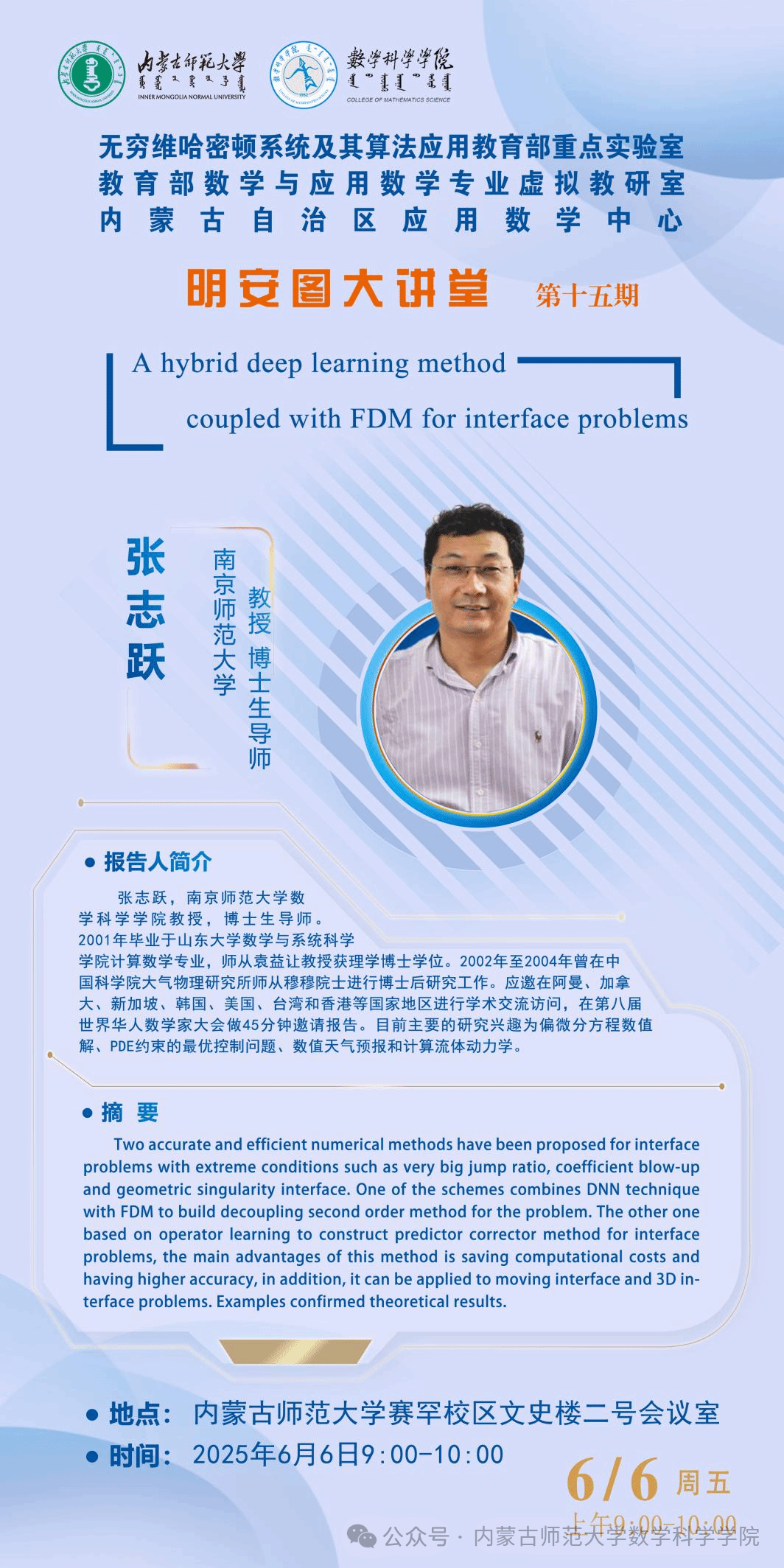 6月6日,ky开元集团明安图大讲堂在ky开元集团赛罕校区文史楼2号会议室成功举办。本次讲座特邀南京师范大学张志跃教授与河海大学博士后研究员ALI作专题学术报告。两场报告分别聚焦深度学习求解界面问题与分数阶微分方程的高精度数值方法,现场互动热烈。