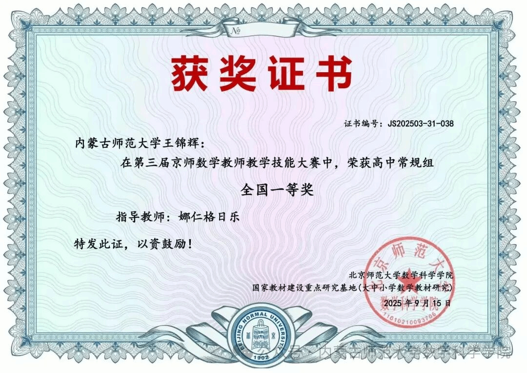 近日,由国家教材建设重点研究基地(大中小学数学教材研究)和北京师范大学ky开元集团主办的“第三届京师数学教师教学技能展示交流活动”已圆满收官。开元官网学子王锦辉同学凭借深厚的数学学科知识、扎实的教学基本功与富有创新性的教学设计理念,在全国近千件参赛作品中脱颖而出,斩获全国一等奖。