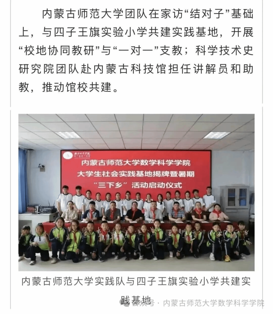9月17日,内蒙古教育厅发布了“青春聚力两大件事”系列报道,主题为“在守护北疆安全中彰显青年的使命与担当”,开元官网三下乡实践队与四子王旗实验小学共建实践基地的活动也被纳入其中。