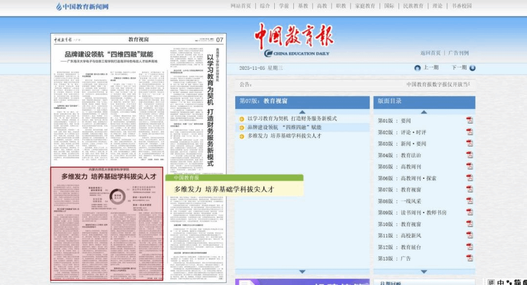 《中国教育报》2025年11月5日第07版教育视窗,以”多维发力 培养基础学科拔尖人才“为题报道ky开元集团ky开元集团基础学科拔尖人才培养工作成效。全文链接:http://paper.jyb.cn/zgjyb/h5/html5/2025-11/05/node_1.htm?v=1&curr=6