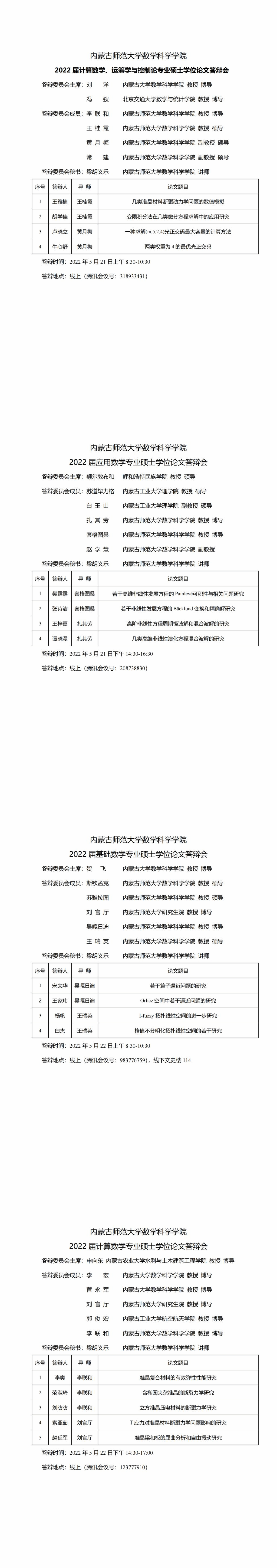 2022届数学专业研究生学位论文答辩会安排表