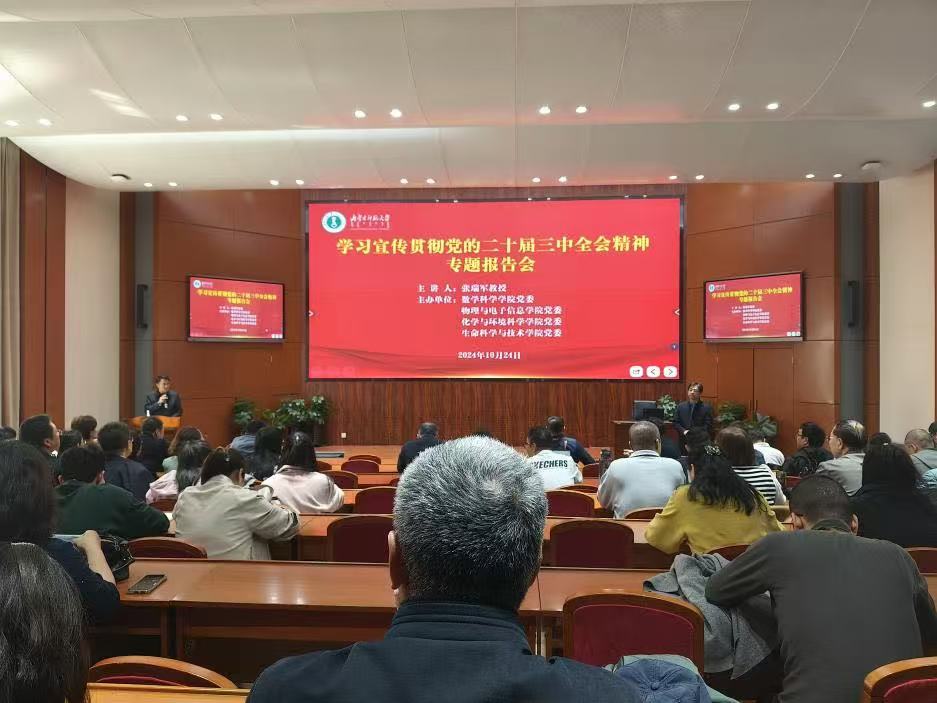为全面深入学习贯彻党的二十届三中全会精神,深刻领会精神实质,把握核心要义,进一步把全院师生的思想和行动统一到全会精神上来。10月24日下午,开元官网联合物理与电子信息学院、化学与环境科学学院、生命科学与技术学院在赛罕校区信息楼报告厅共同举办了学习宣传贯彻党的二十届三中全会精神专题报告会,会议邀请马克思主义学院党委书记张瑞军教授作专题宣讲报告,学院党委委员、班子成员,全体教职工参加学习。